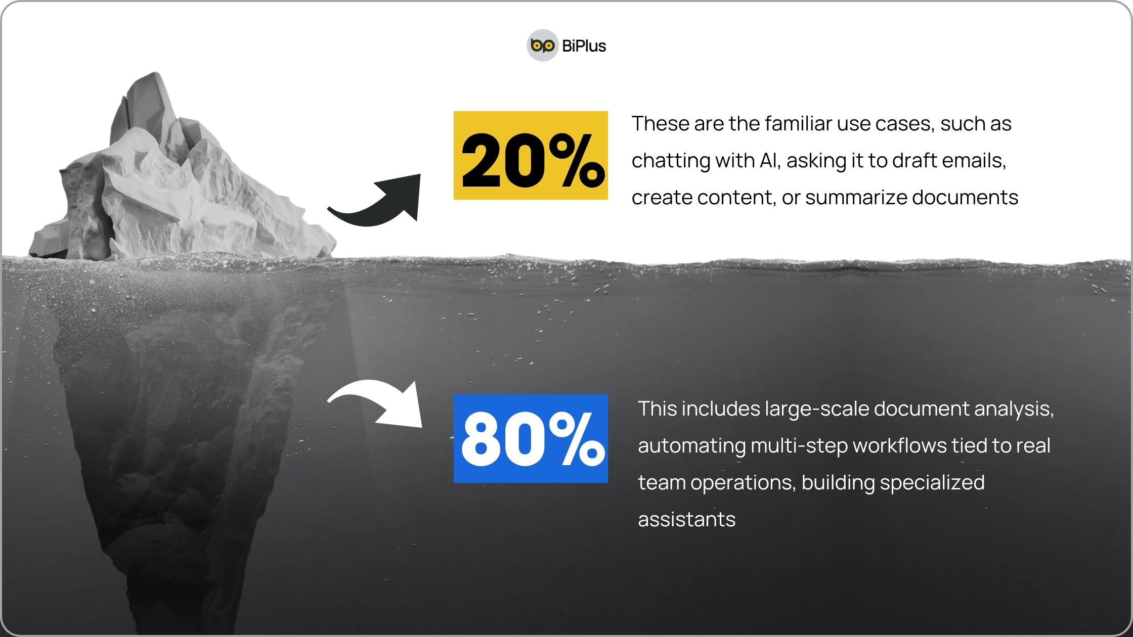 A useful analogy for this situation is an iceberg. The visible and frequently used part is just about 20%. These are the familiar use cases, such as chatting with AI, asking it to draft emails, create content, or summarize documents.